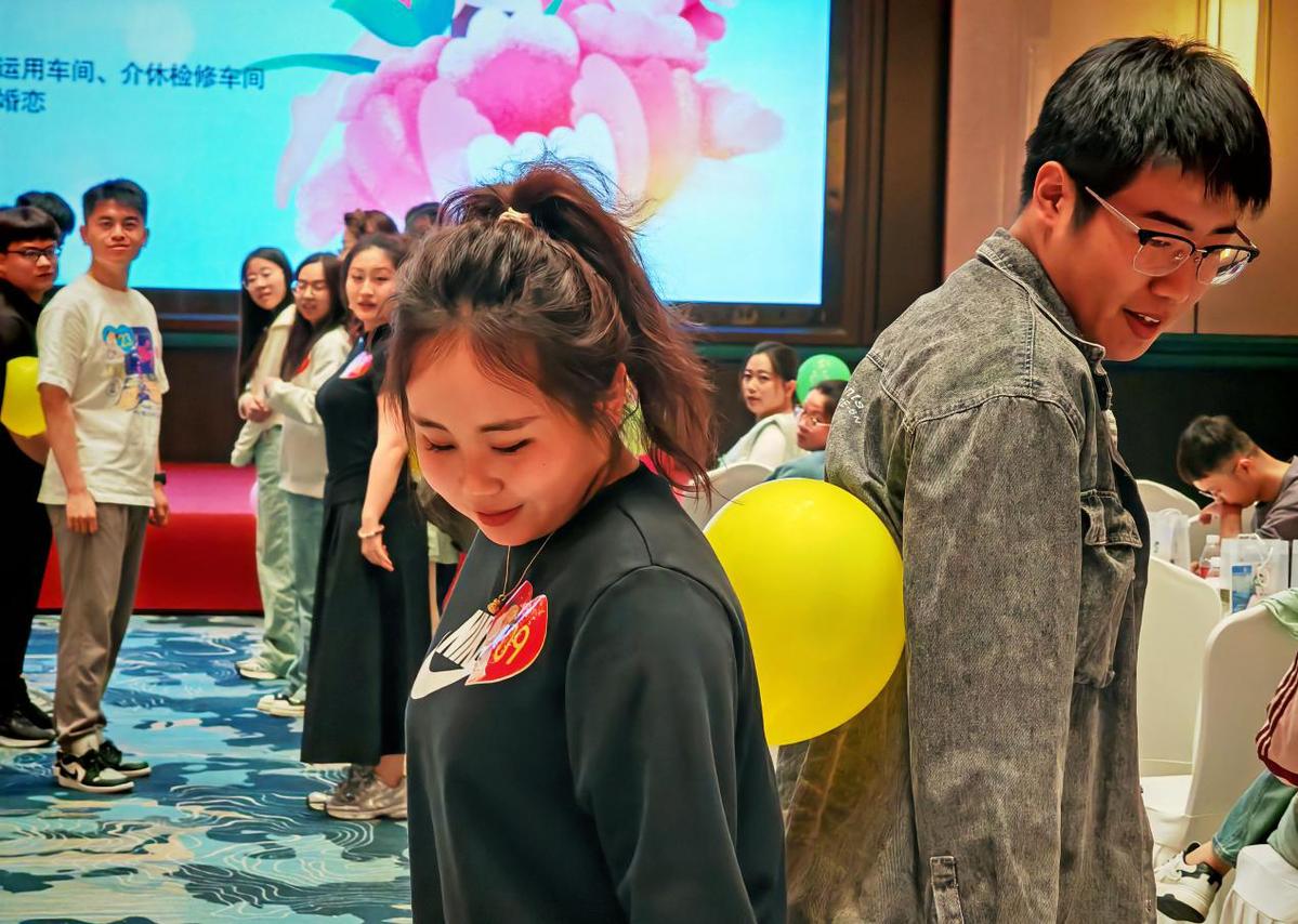 2025年5月,在中国铁路太原局侯马北机务段举办的青年婚恋活动上,女嘉宾玩起了互动捏气球游戏。 (主办方供图)