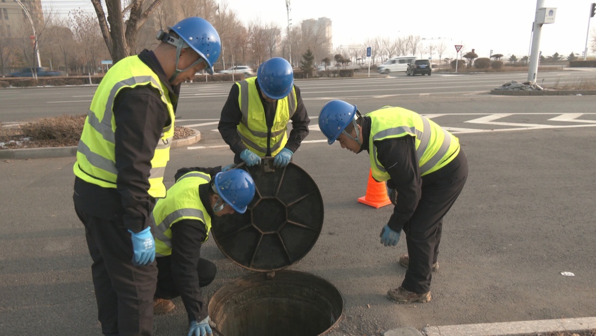 在世纪大道与石河子路交叉口,工作人员正在检查管井,对地下水供水阀门进行系统检查,手动检测阀门启闭的灵活性和密封性,重点检测垫片是否有泄漏或不易察觉的隐藏温度情况,确保管道节点在低温条件下可靠运行。